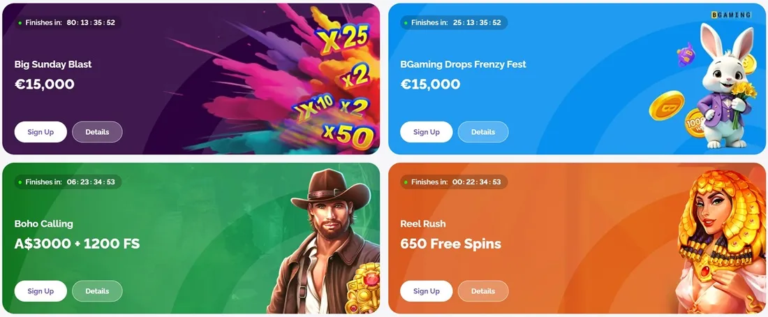 The “Tournaments” tab is often busy, with new contests being added regularly. Often, these are based on how much you bet on specific slot games. Monitoring your tournament performance is easy thanks to live leaderboards.